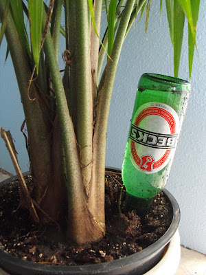 Jednostavno popijte pivo (po mogućnosti domaće 🙂 ), ulijte vodu u bocu piva te ju prilikom okretanja zabijte u zemlju. Voda će se polako otpuštati u zemlju, te što je zemlja mokrija sporije će curiti iz boce. Ukoliko je veća biljka koristite veću bocu.